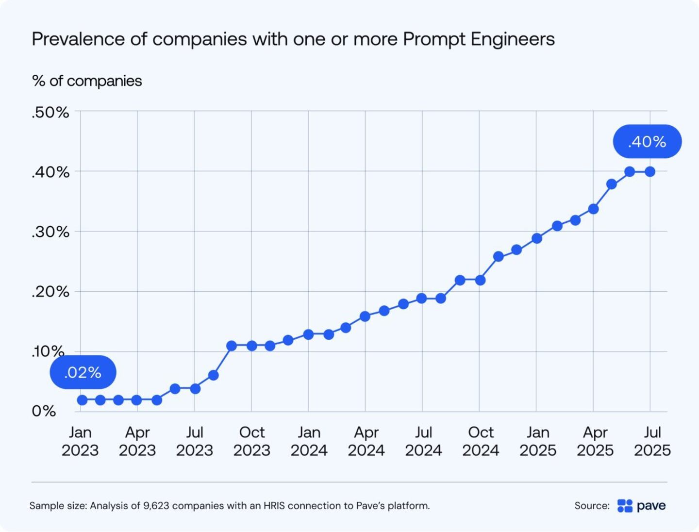Let’s start by exploring Prompt Engineers, people who specialize in effectively using AI language models. While some will debate the value and long-term staying power of this role, for now, the prevalence of this still-nascent job is increasing. When Pave examined all companies connected to its database, the prevalence of companies with at least one Prompt Engineer grew from 0.02% in January 2023 to 0.40% in July 2025. While the absolute number of people in this role is still very low, the prevalence of this job is growing quickly relative to others.