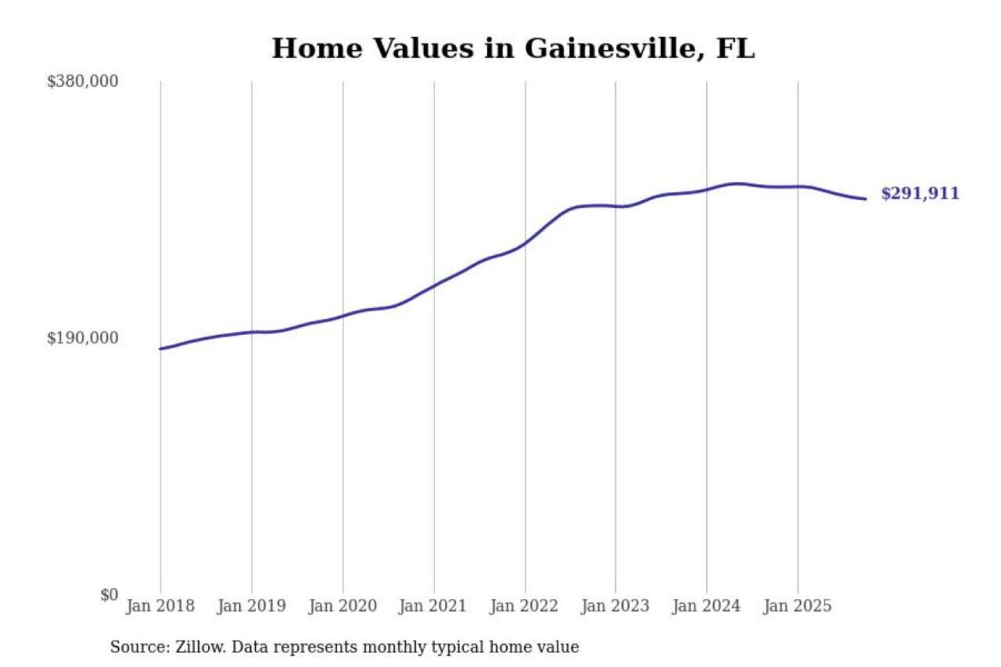 Stacker compiled a list of cities with the most expensive homes in the Gainesville metro area using data from Zillow. Charts show the monthly typical home value since January 2018. All 21 cities and towns with data available were included in the list.