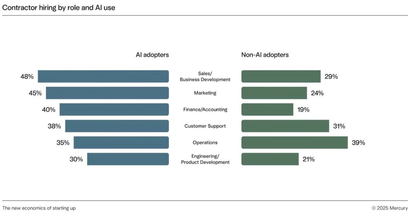 It’s also a question of degree. 45% of significant AI adopters said they’re “very reliant” on contractors, compared to just 12% of non-AI adopting companies — nearly a 4x difference.