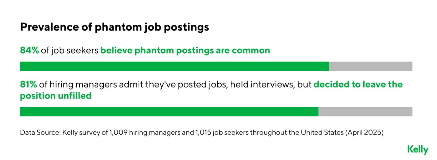 Eighty-four percent of job seekers say they believe phantom postings are common. Among hiring managers, 81 percent admit they have posted jobs, conducted interviews and then decided to leave the position unfilled. Nearly one in three say they use the tactic frequently. The top reasons companies do this are building a pipeline for future roles and gathering industry insights.