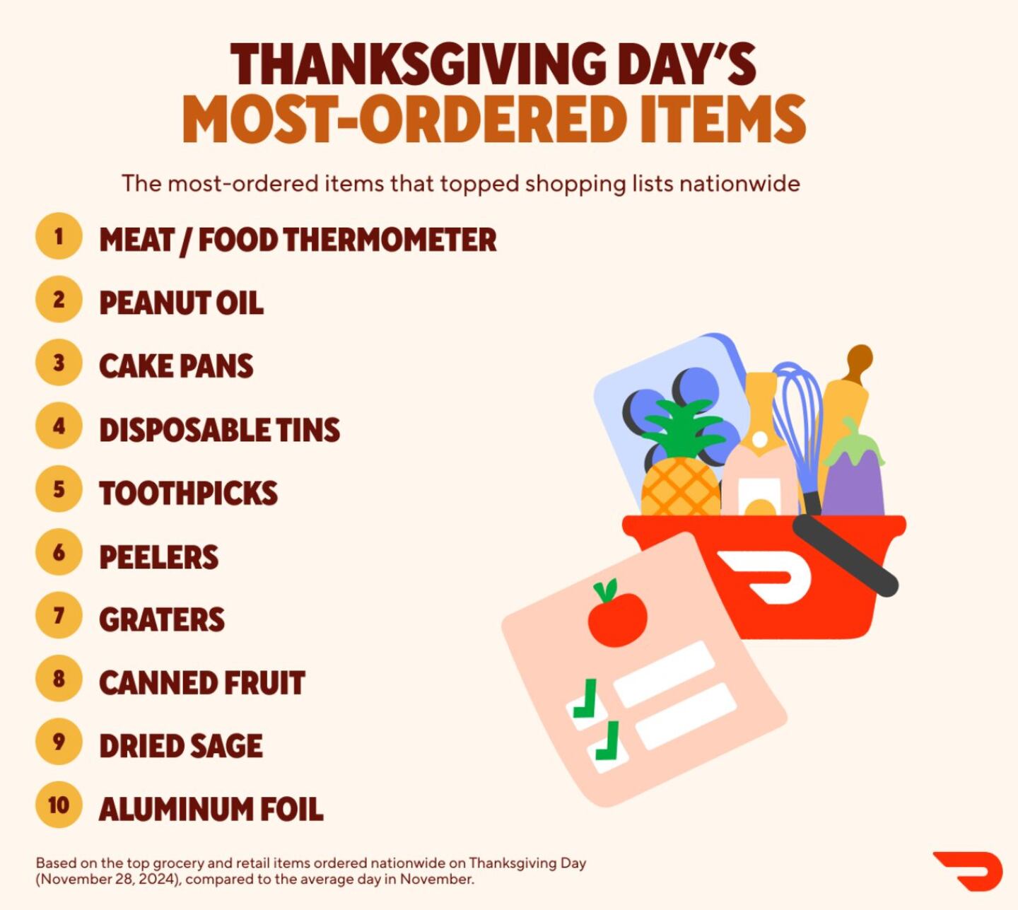 Thanksgiving may be rooted in tradition, but DoorDash ordering data reveals just how modern, and surprising, people's holiday habits have become. From panic buys and forgotten essentials, ordering data from Thanksgiving 2024 shows how families really prep and celebrate the biggest food holiday of the year. Covering restaurants, grocery, alcohol and retail, this year's DoorDash report serves up the full spread.