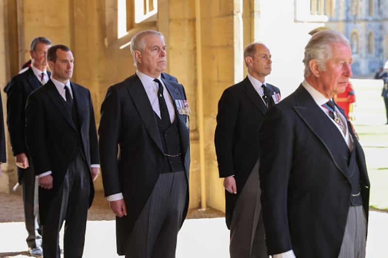 Through the years Vice-Admiral Sir Timothy Laurence, Peter Phillips, Prince Andrew, Duke of York, Prince Edward, Earl of Wessex and Prince Charles, Prince of Wales during the funeral of Prince Philip, Duke of Edinburgh at Windsor Castle on April 17, 2021 in Windsor, England. Prince Philip of Greece and Denmark was born 10 June 1921, in Greece. He served in the British Royal Navy and fought in WWII. He married the then Princess Elizabeth on 20 November 1947 and was created Duke of Edinburgh, Earl of Merioneth, and Baron Greenwich by King VI. He served as Prince Consort to Queen Elizabeth II until his death on April 9 2021, months short of his 100th birthday. His funeral takes place today at Windsor Castle with only 30 guests invited due to Coronavirus pandemic restrictions. (Photo by Chris Jackson/WPA Pool/Getty Images) (Chris Jackson / Getty Images/WPA Pool/Getty Images)