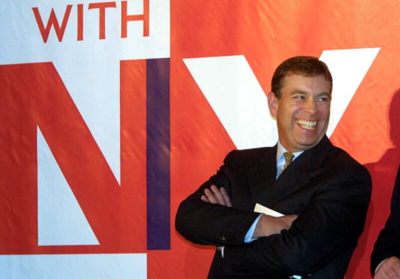 Through the years Britain's Prince Andrew laughs before speaking at the "Great Expectations" design exhibit opening October 16, 2001 at Grand Central Station in New York City. The exhibit showcases British business design and innovation. (Photo by Mario Tama/Getty Images) (Mario Tama/Getty Images)