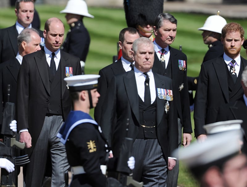 Through the years Prince Andrew, Duke of York; Prince Harry, Duke of Sussex; Prince William, Duke of Cambridge and Vice-Admiral Sir Timothy Laurence walk behind The Duke of Edinburgh’s coffin, covered with His Royal Highness’s Personal Standard, during the Ceremonial Procession during the funeral of Prince Philip, Duke of Edinburgh at Windsor Castle on April 17, 2021 in Windsor, England. Prince Philip of Greece and Denmark was born 10 June 1921, in Greece. He served in the British Royal Navy and fought in WWII. He married the then Princess Elizabeth on 20 November 1947 and was created Duke of Edinburgh, Earl of Merioneth, and Baron Greenwich by King VI. He served as Prince Consort to Queen Elizabeth II until his death on April 9 2021, months short of his 100th birthday. His funeral takes place today at Windsor Castle with only 30 guests invited due to Coronavirus pandemic restrictions. (Photo by Mark Large-WPA Pool/Getty Images) (MARK LARGE/Getty Images)