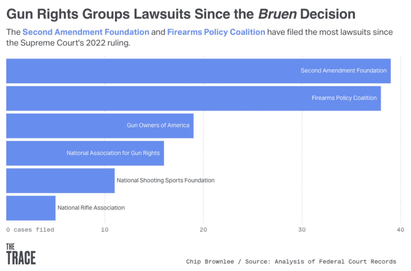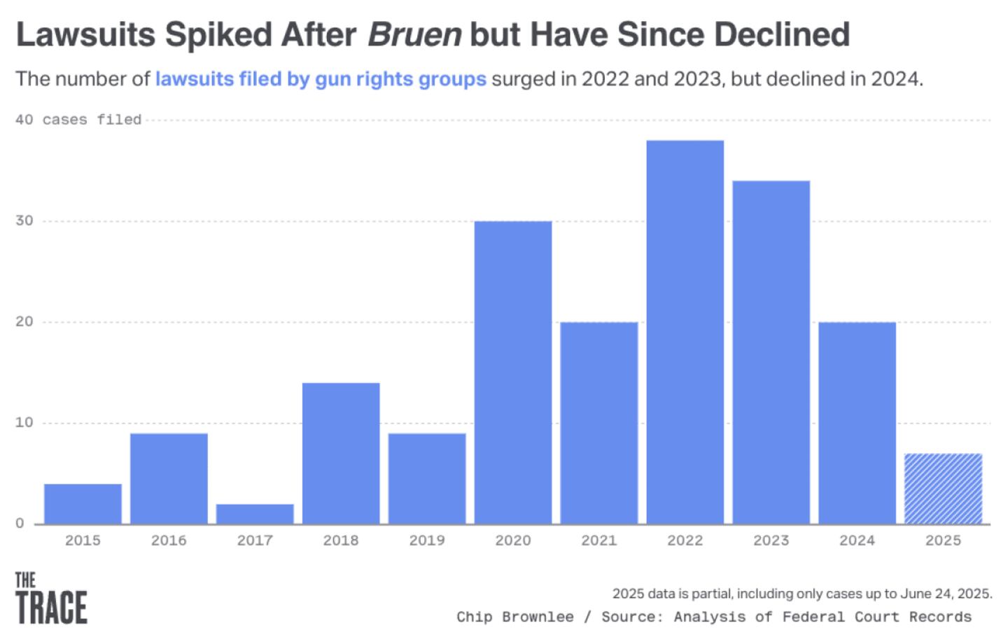 In the five years before Bruen, leading gun groups filed nine challenges to hardware bans. That figure doubled to 18 in the second half of 2022, following the Bruen ruling. There were seven such challenges filed in 2023, two last year, and none so far in 2025.