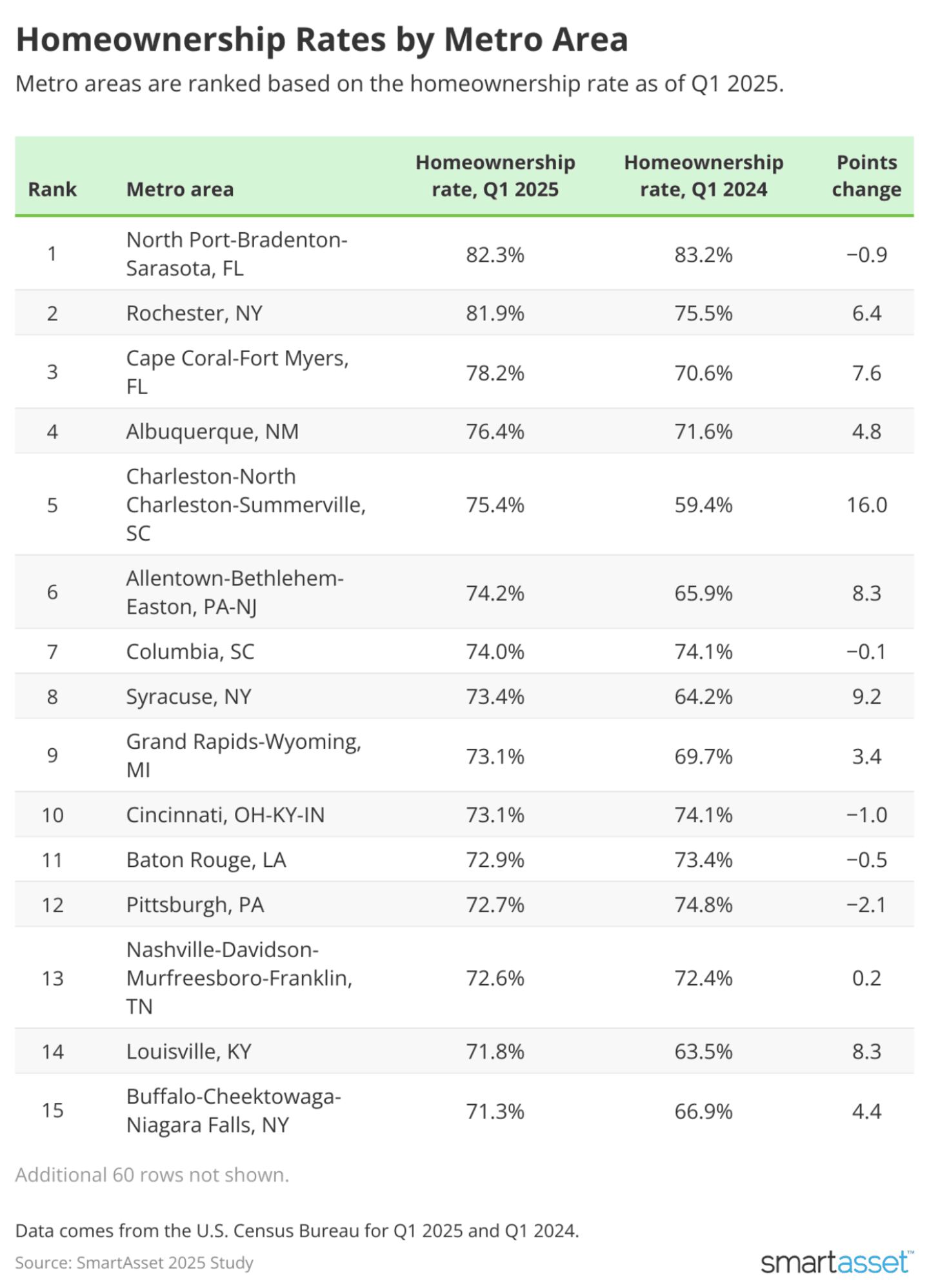 For this SmartAsset study, data for homeownership rates across U.S. metro areas comes from the U.S. Census Bureau for Q1 2025 and Q1 2024. Data for typical home values comes from Zillow's Home Value Index for all homes, smoothed and seasonally adjusted, for March 31, 2025 and March 31, 2024.
