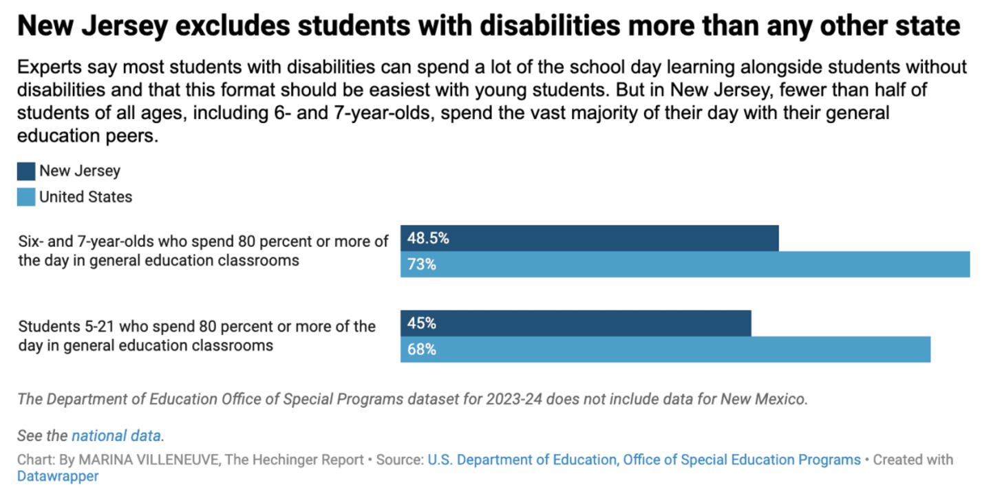 More than anywhere else in the country, New Jersey students with disabilities fail to reach this threshold, according to federal data. Instead, they spend significant portions of the school day in separate classrooms where parents say they have little to no access to the general curriculum — a practice that can violate their civil rights under federal law.